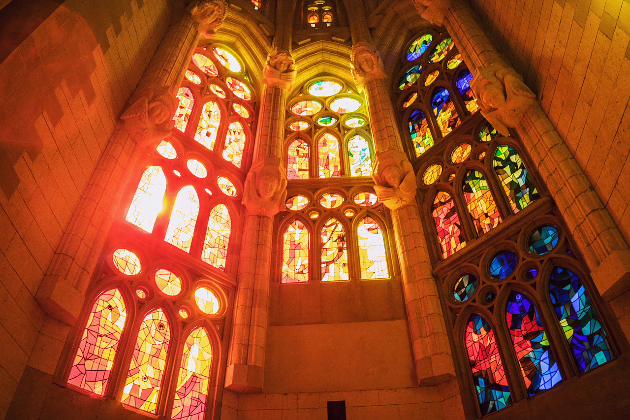 陽(yáng)光透過(guò)形狀各異的彩色的琉璃窗灑下,邂逅彩虹一樣的光幕,紅黃橙綠交織著從天穹而下,美妙又神圣,似乎真的觸手可及,整個(gè)教堂變幻著奇特的光芒,讓人驚嘆不已。