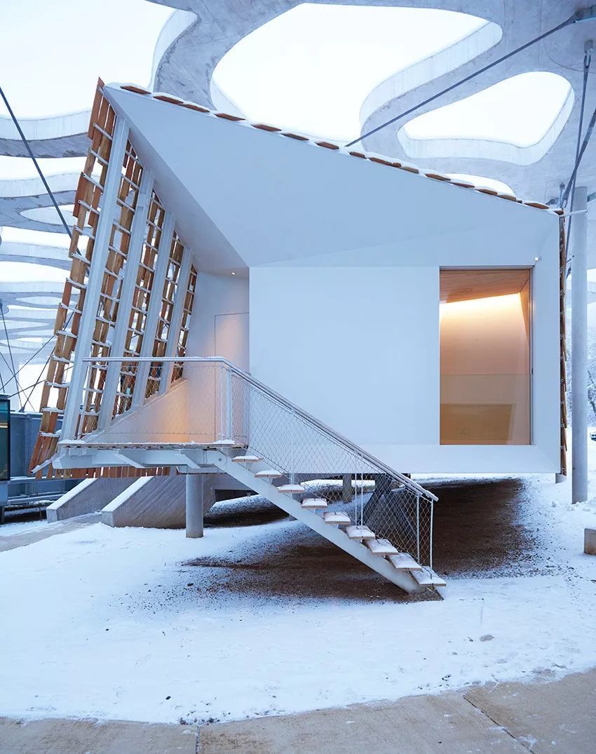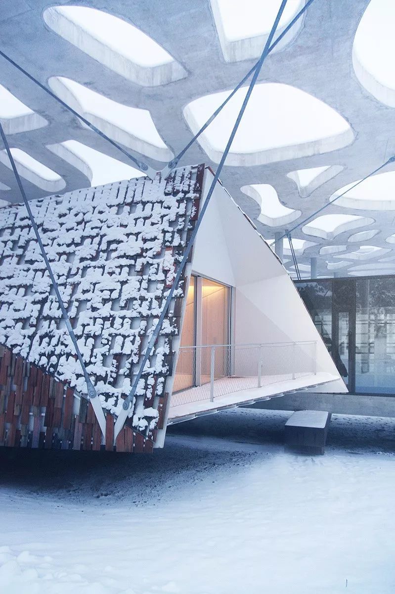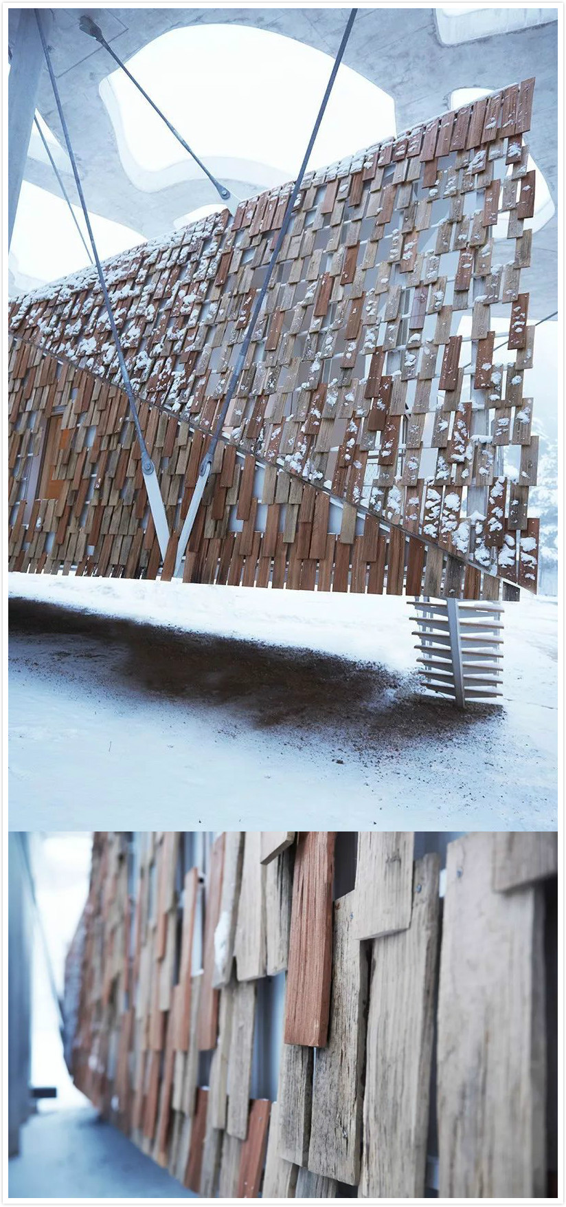 建筑采用防水的白色鋼板作為外立面的材料,再以木板一片一片隨機疊加在最外層,包裹起整個建筑。這些木板均是取材于當地森林的橡木和落葉松木,再通過手工切割制作而成。