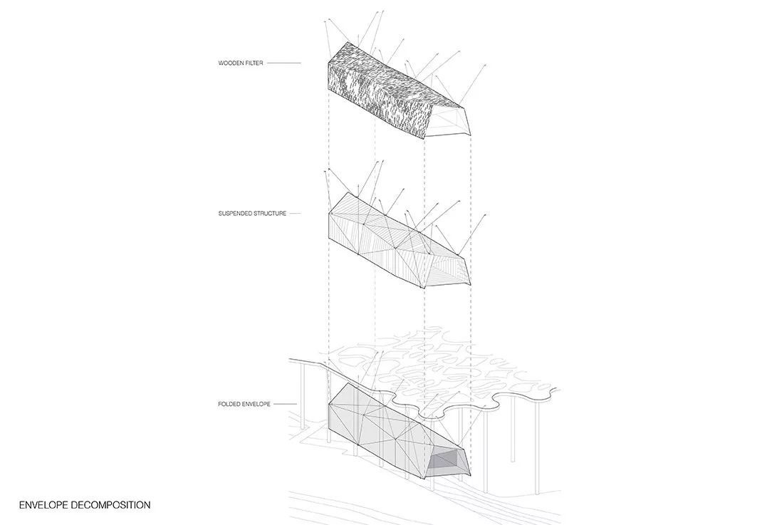 菱形的屋面互相重疊,像是沿著湖畔的山丘一般,與周圍環境完美地融合在一起。每個屋頂都設有鋁板百葉,營造出一種猶如置身于茅草涼亭內,陽光透過“茅草”屋頂灑進室內,望著屋外波光粼粼的湖水,給游客帶來無比愜意的體驗感。