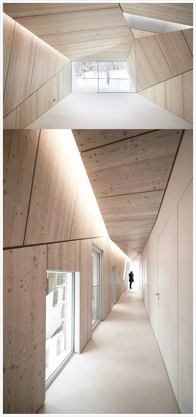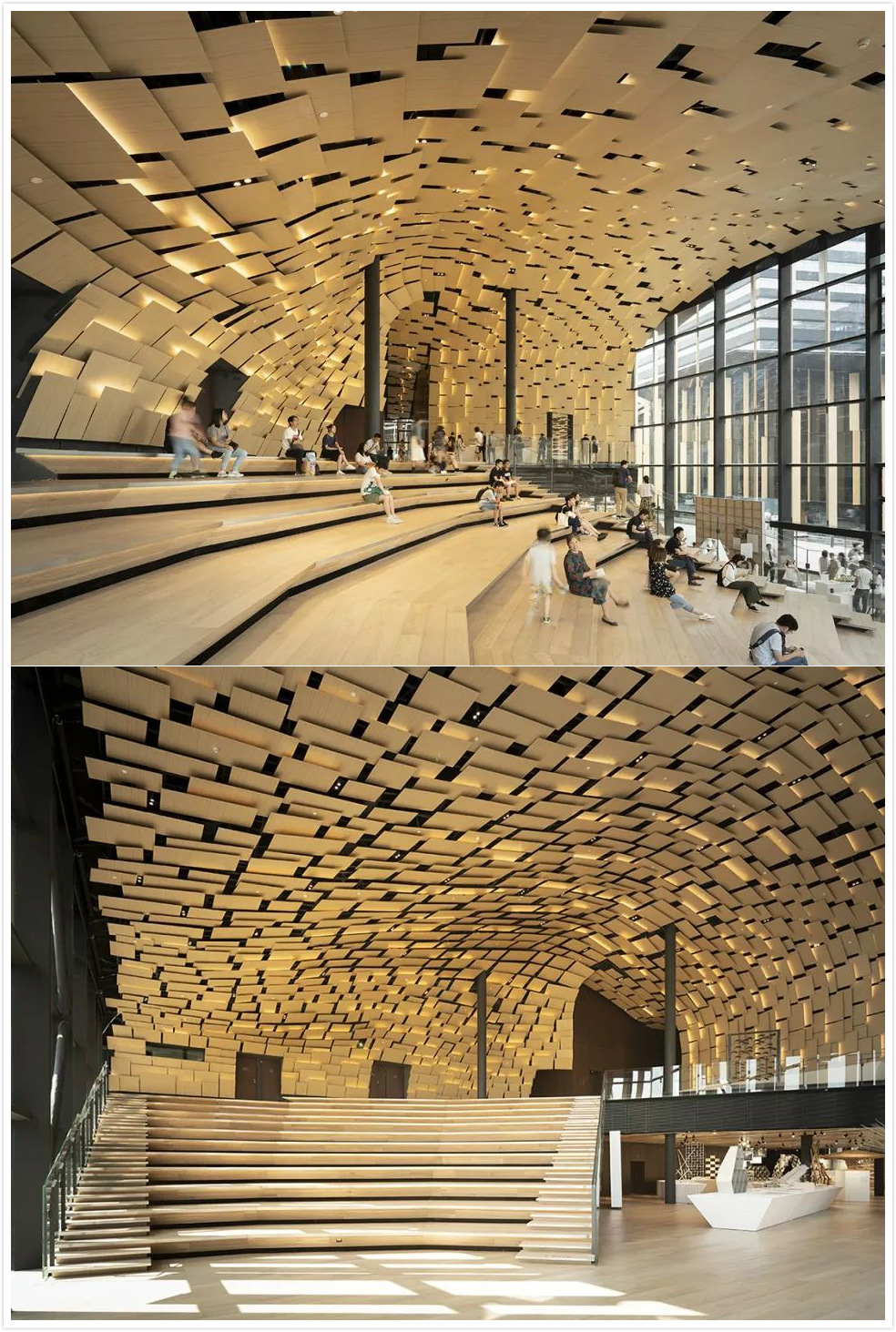 建筑內部的天花采用模板片不規則地排列著,陽光從模板片中透進來,斑駁閃耀,似乎又置身于樹木繁茂的森林中。