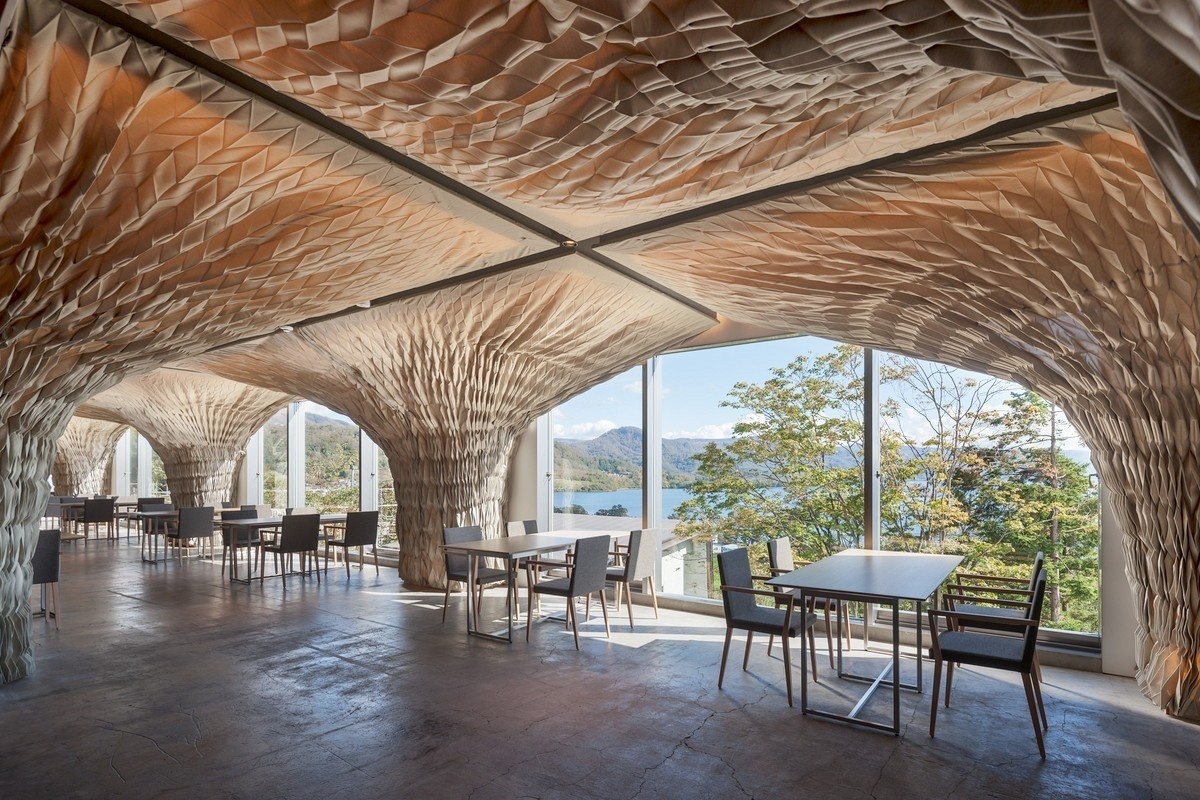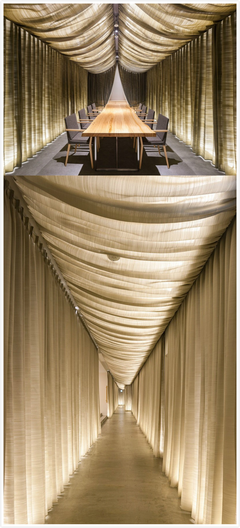 帶有皺褶的布幃從天花板垂降而下,妝點飯店大廳和餐廳區域。據稱設計團隊受洞爺湖輕柔的霧氣啟發,因此以織物打造有如洞穴般的折布世界。