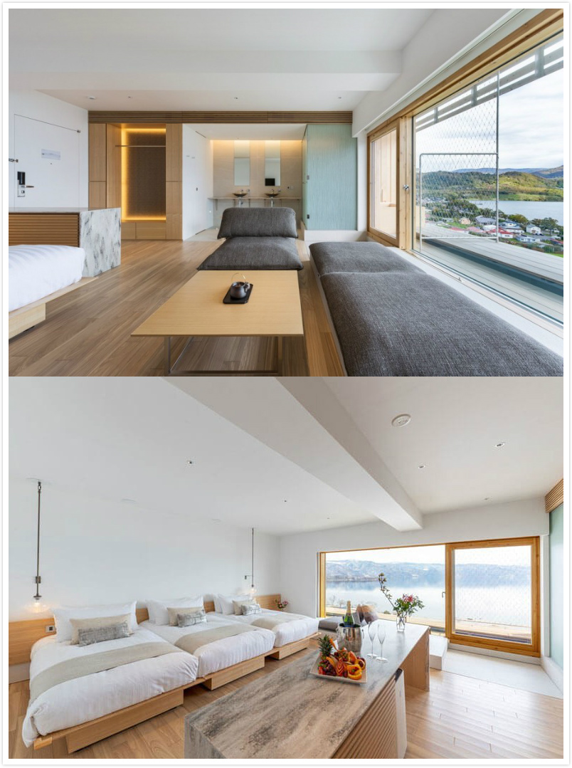 酒店高六層樓,共55 間客房,每間客房都是備有戶外湯和觀景窗的湖景風呂房!隈研吾團隊在客房陽臺裝設了柏木浴缸,房客一邊享受洞爺湖美不勝收的景色,同時也能沉浸在柏木的香氣之中。
