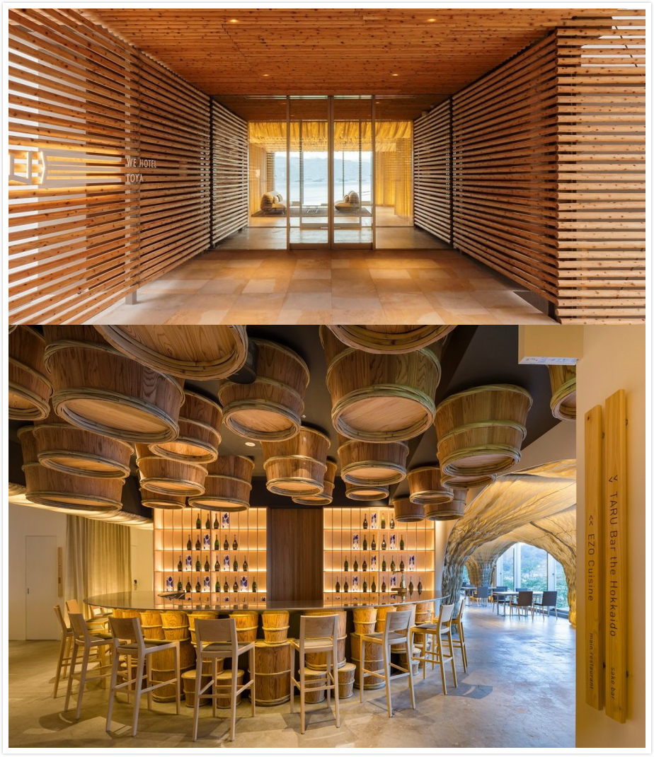 由隈研吾建筑都市設計事務所設計監修的WE Hotel Toya ,坐落在北海道的札幌,其前身是一間養老院,通過設計師的精心雕塑下變身為一家舒適悠然的精品酒店。酒店位在波光渺渺的洞爺湖畔,隈研吾取湖泊豐富的自然景觀為靈感,以「雪松木材」和「棉麻布料」創作出戲劇性與和諧感兼具的空間。