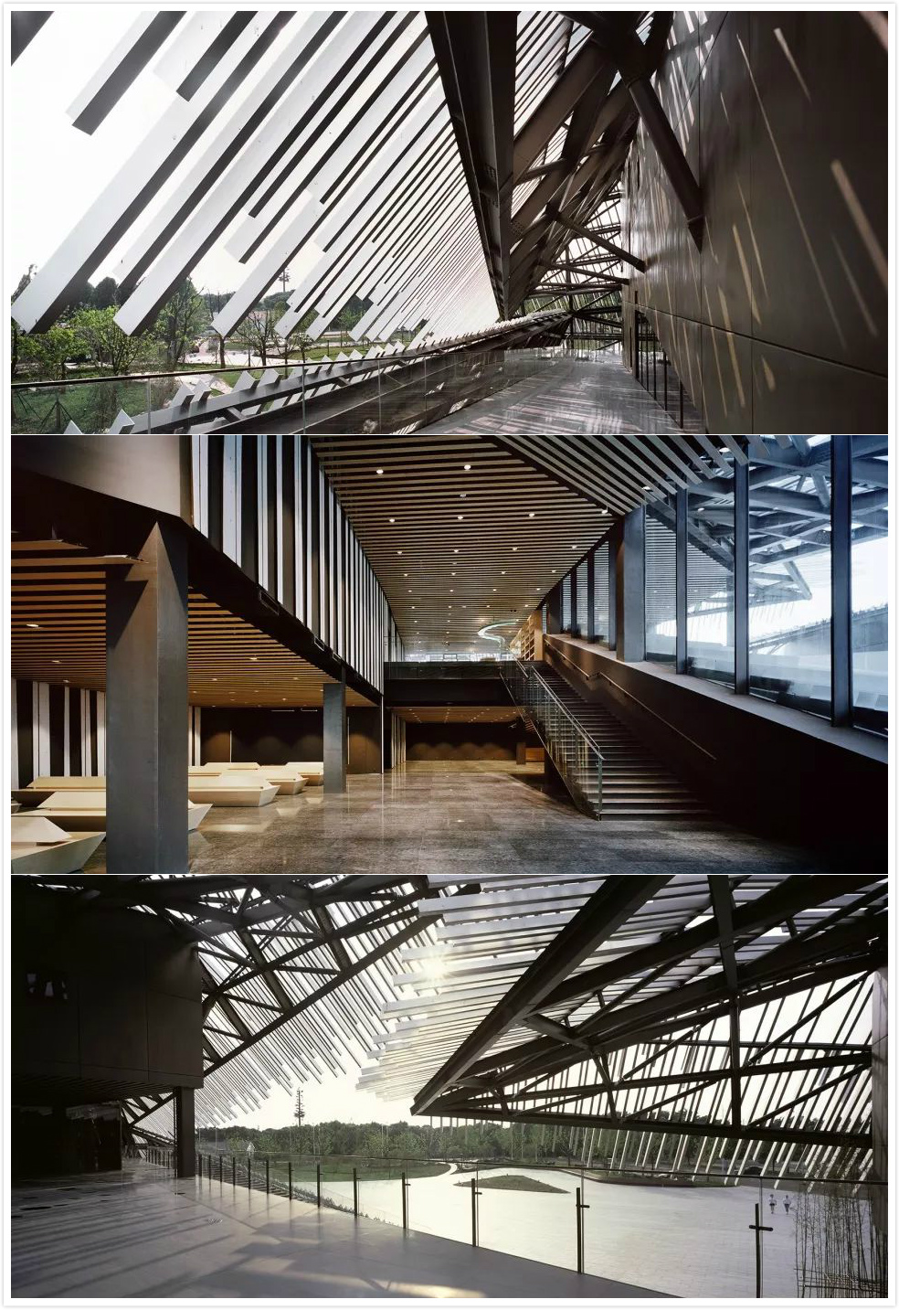大廳的屋頂取當地木材所設計的成木構系統,起到自然通風且利用自然光源的作用,將建筑與河流、天空聯系起來。