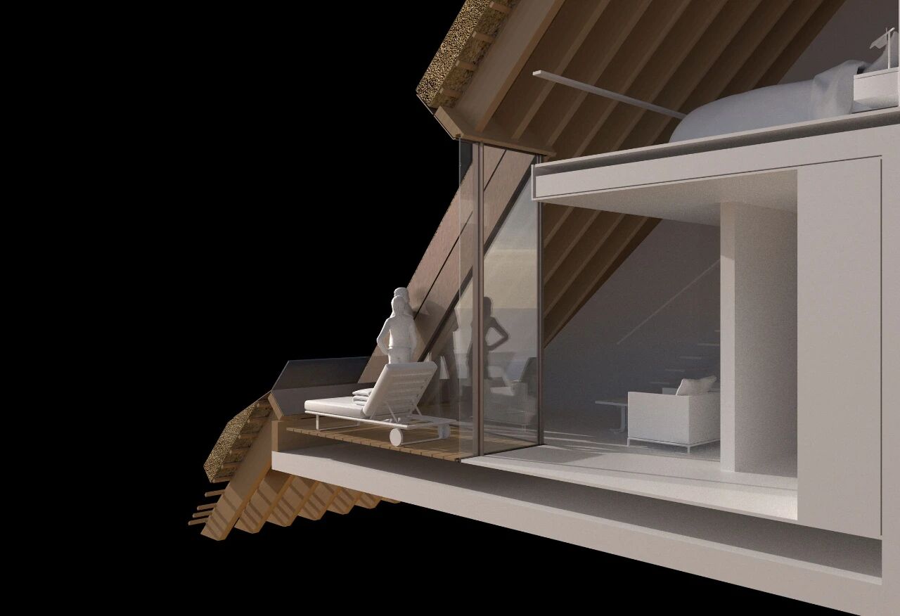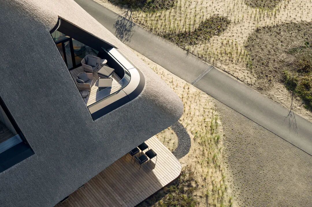 32間客房中,每間都配有帶遮擋的室外區(qū)域,涼棚設(shè)置在屋檐之下,讓住客在沙丘與森林的懷抱中靜思。