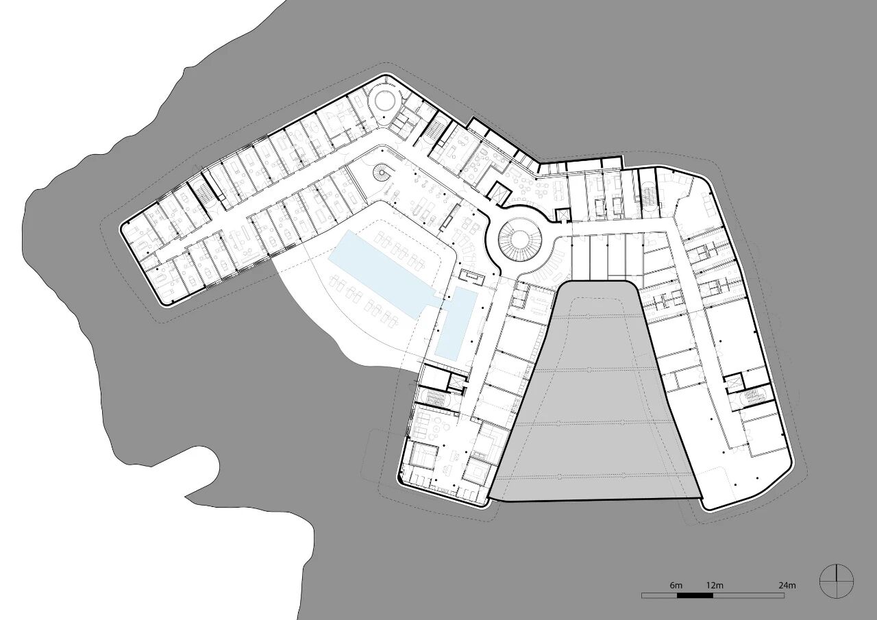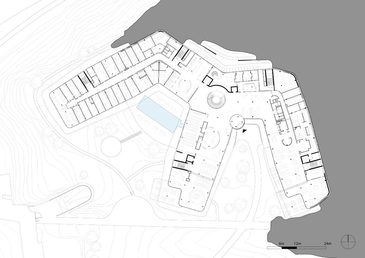 內(nèi)墻與外墻采用平整或有紋理的天然飾面,餐飲區(qū)與水療區(qū)地面水磨石由當(dāng)?shù)氐[石與石材混合替代,實(shí)現(xiàn)材料的地域性與可持續(xù)性。