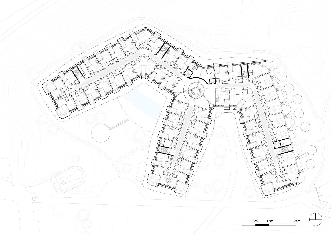 選址曾為20世紀(jì)30年代軍事區(qū)域,建筑群巧妙融合場地歷史,賦予療愈空間更深層的精神內(nèi)涵。