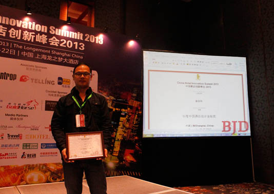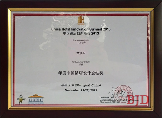 中國酒店創新峰會于11月21日舉辦頒獎典禮,旨在表彰在酒店行業尤其是創新領域做出卓越貢獻的企業及個人,為行業樹立新的標桿。作為酒店設計界內的一員,BJD酒店設計機構設計總監徐宗華榮獲“年度中國酒店設計金鉆獎”。徐宗華設計總監對于此次獲得中國酒店創新峰會授予的“年度中國酒店設計金鉆獎” 深感榮幸,這不僅是對個人更是對BJD酒店設計機構一直以來的努力給予了肯定,使我們更加堅定我們企業創立時的精神:“精益求精 自強不息 永不言敗”;并要求我們在今后的企業發展中繼續實行公司的核心價值理念: “嚴格要求 超越自我 做到最好”。