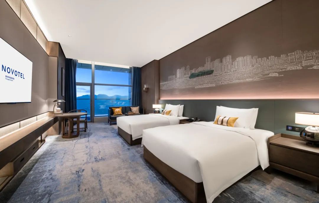 客房床頭背景墻的設計尤為引人注目,設計師們巧妙地將重慶嘉陵江的壯麗景色定格于此,通過高清打印技術,使得畫面栩栩如生,仿佛能夠聽到遠處傳來的江水潺潺聲。