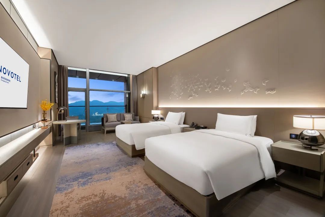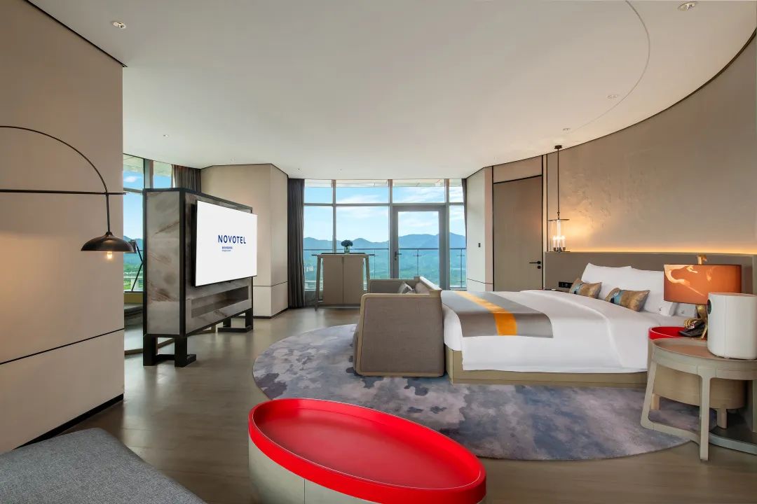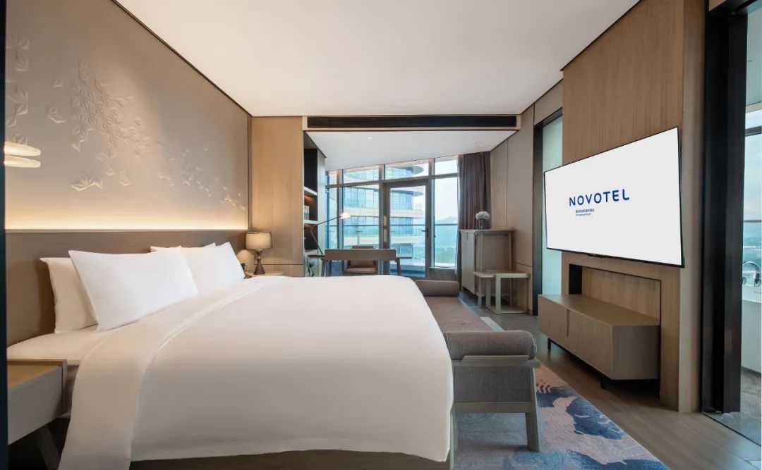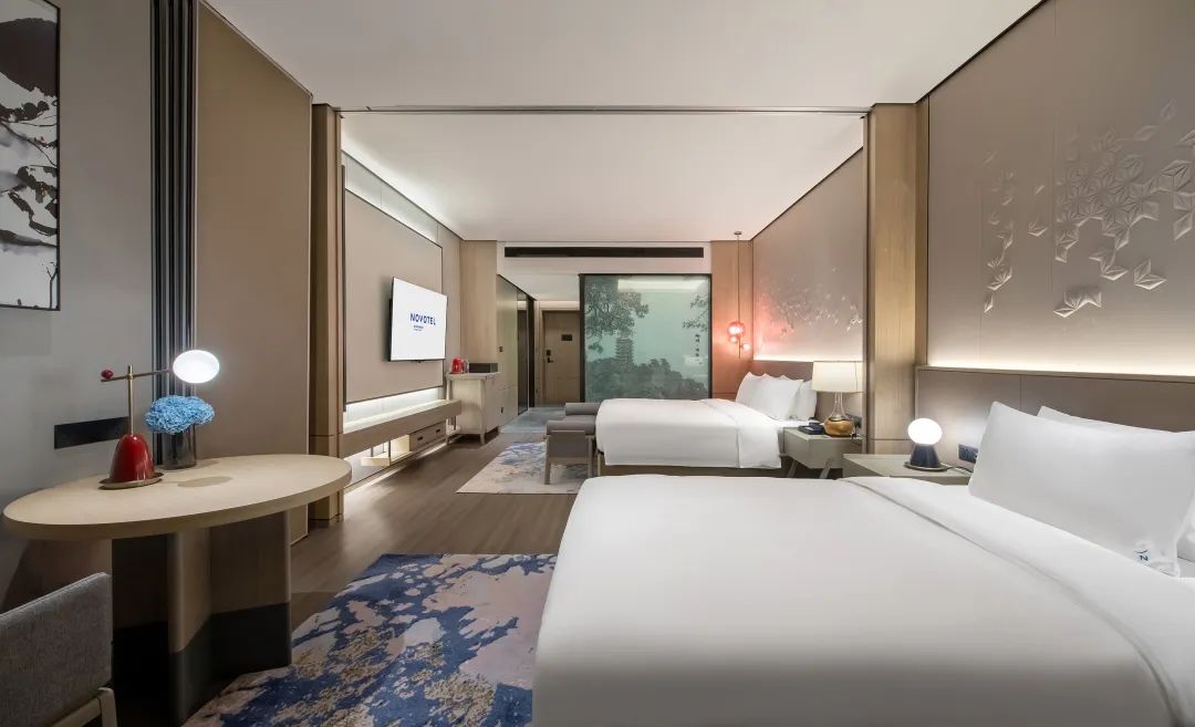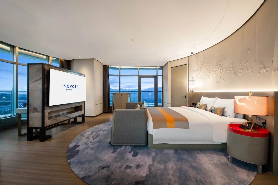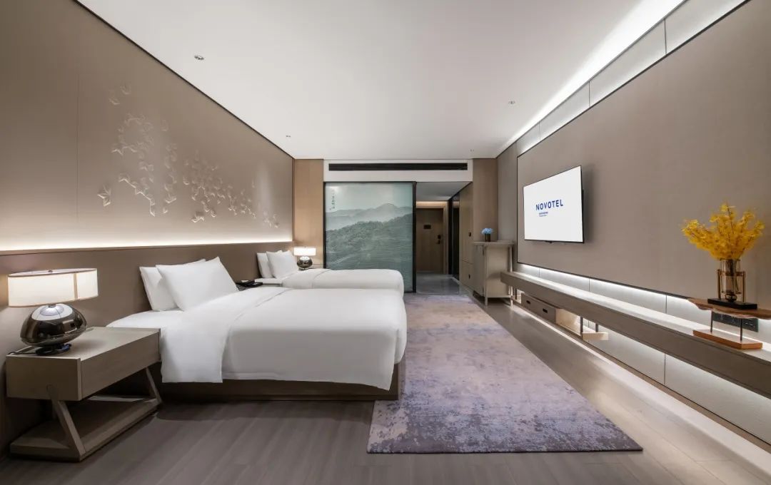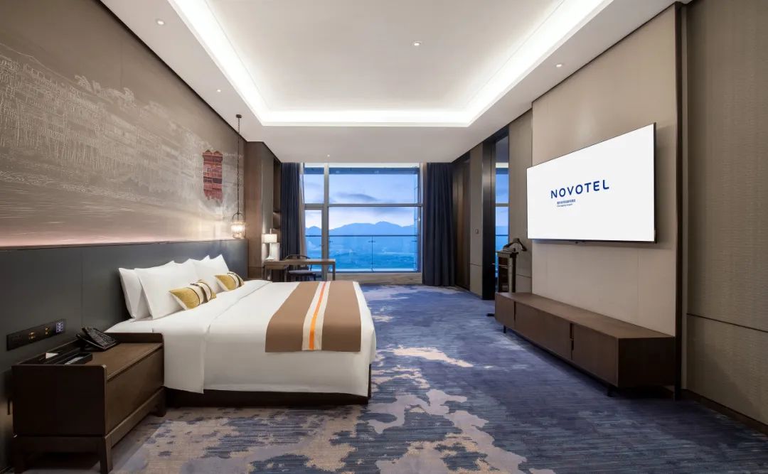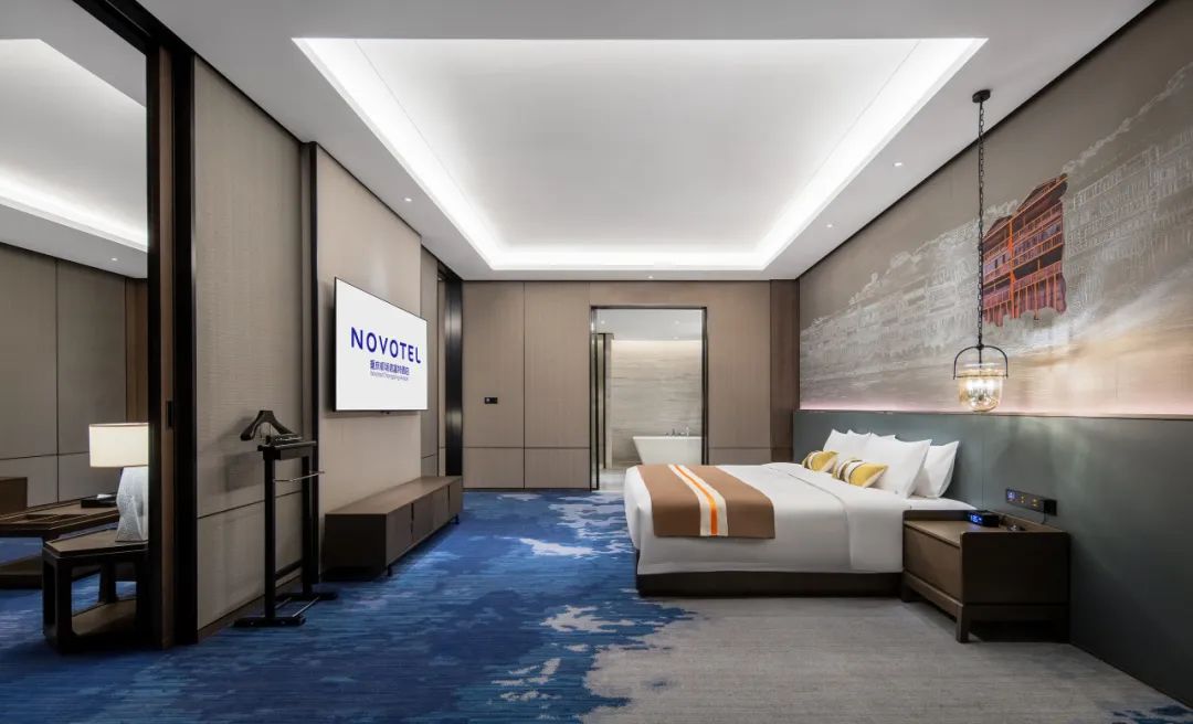 在諾富特酒店的現代客房中,設計師們巧妙地將現代簡約風格與新中式元素相結合,創造出了一個既時尚又富有文化底的居住空間。