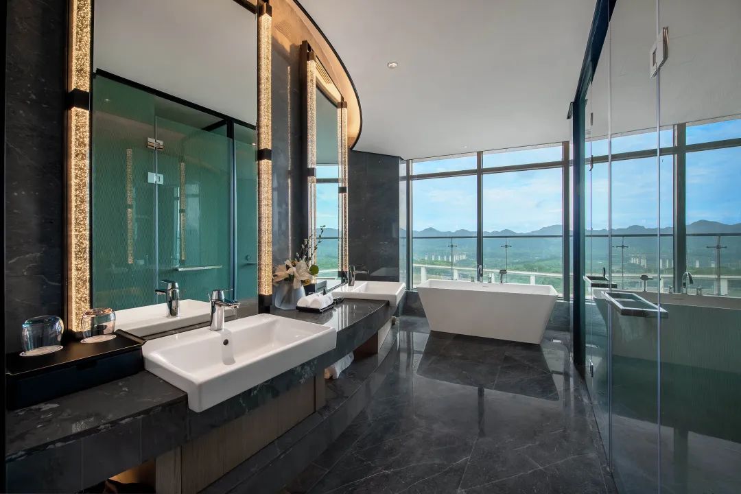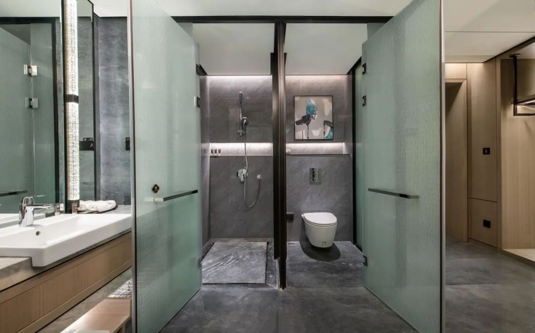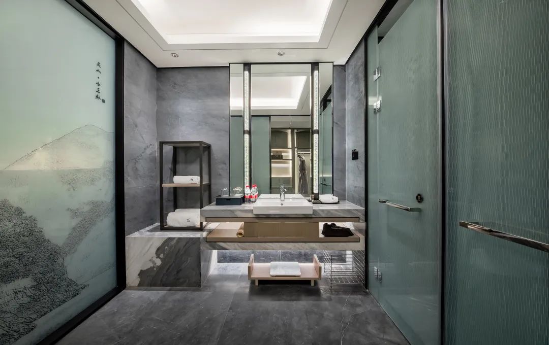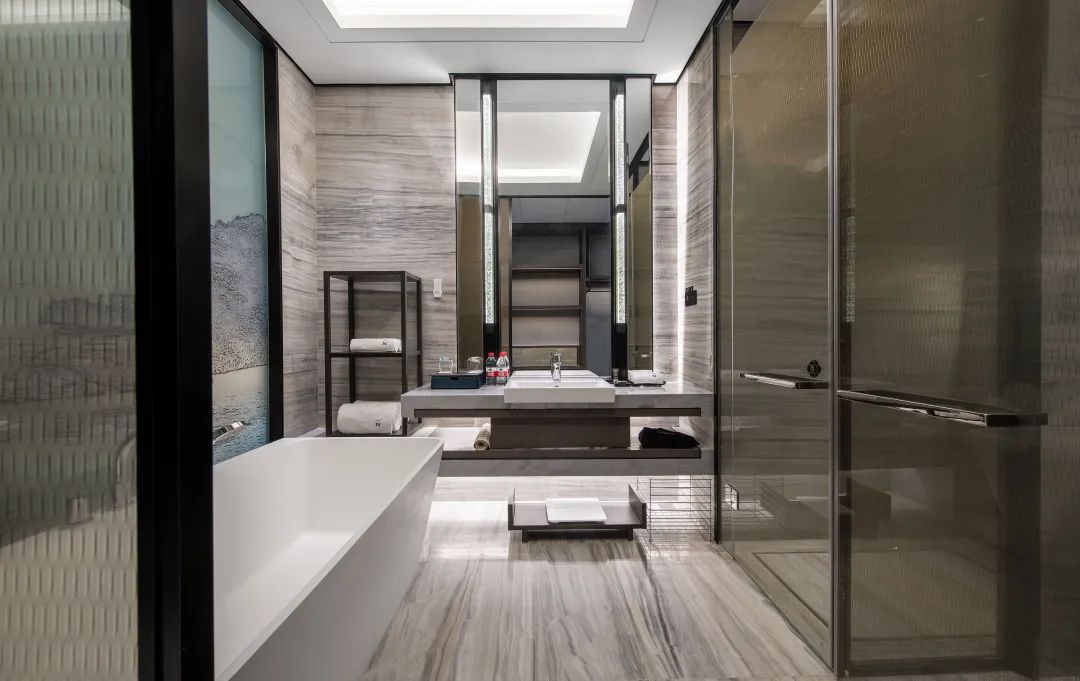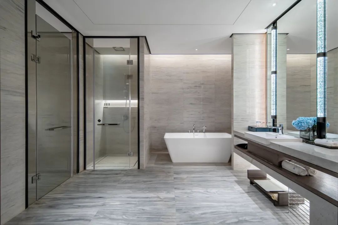 浴室中,輕奢、新中式與現代簡約三種風格交織在一起,創造出一種前所未有的視覺享受。