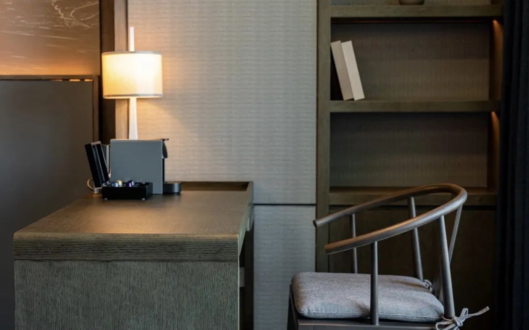 這些客房內的家具選用了帶有新中式風格家具,它們與現代簡約的裝飾形成鮮明對比,卻又和諧共生。